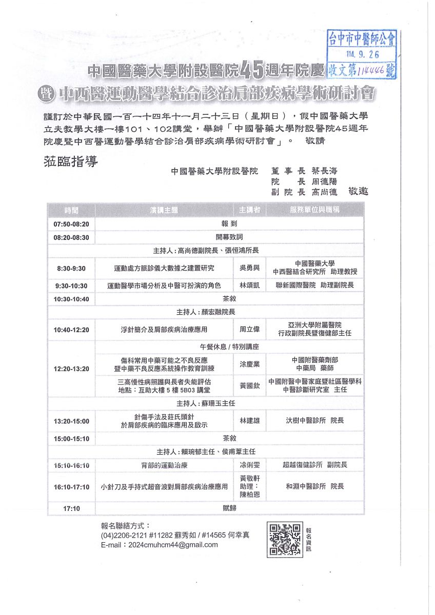 中國醫藥大學附設醫院:謹訂於114年11月23日舉辦「中國醫藥大學附設醫院45週年院慶暨中西醫運動醫學結合診治肩部疾病學術研討會」。