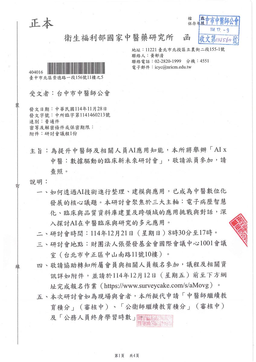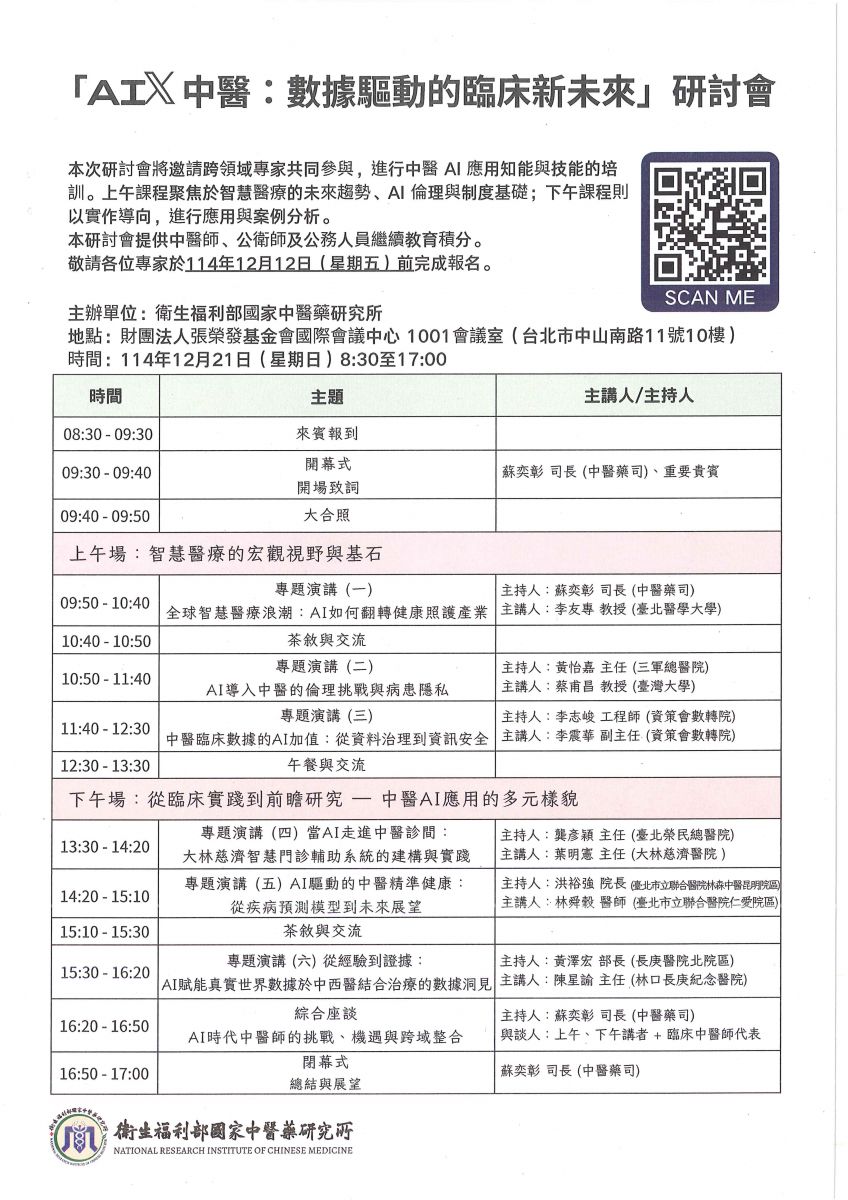 衛生福利部國家中醫藥研究所為提升中醫師及相關人員AI應用知能,訂於114年12月21日舉辦「Aix中醫:數據驅動的臨床新未來研討會」。