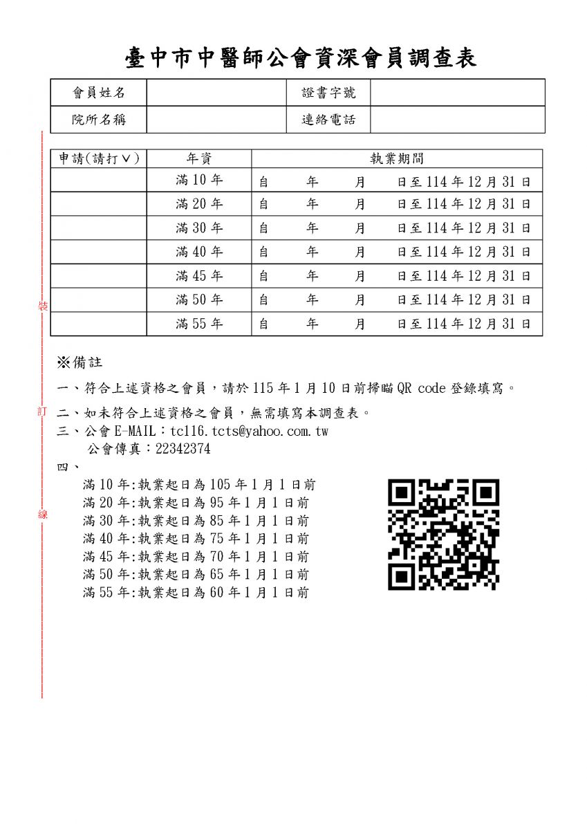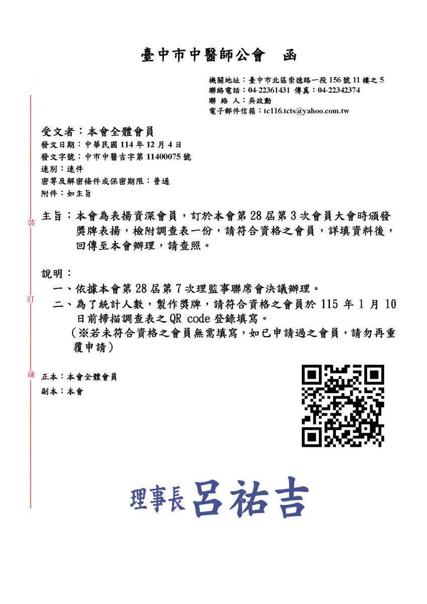 本會為表揚資深會員,訂於本會第28屆第3次會員大會時頒發獎牌表揚,請符合資格之會員,詳填調查表資料後於115年1月10日前回傳本會辦理,請查照。